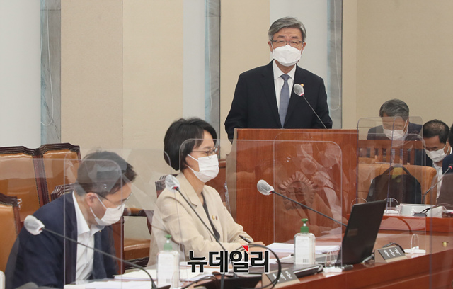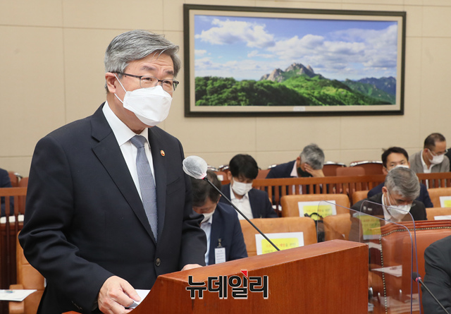 이재갑 고용노동부 장관이 22일 오전 국회에서 열린 환경노동위원회 전체회의에서 출석해 업무보고를 하고 있다.(사진=국회사무처)