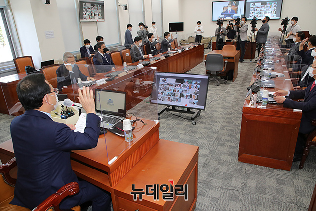 주호영 국민의힘 원내대표가 22일 국회에서 열린 화상 의원총회에서 회의주재를 하고 있다. (사진=국민의힘)