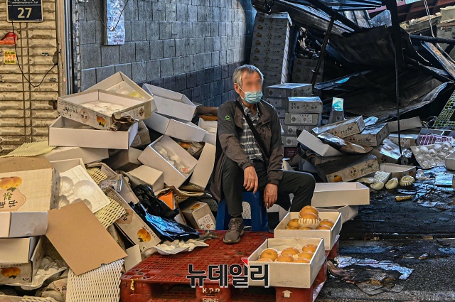 추석연휴를 앞둔 22일 오후 서울 동대문구 청량리 청과물시장에서 한 상인이 화재로 타버린 가게 앞에서 과일을 팔고 있다.