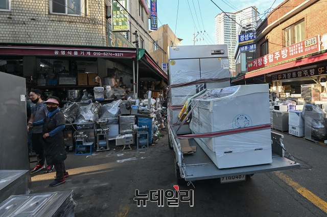 '코로나19(중국 우한 폐렴)'가 장기화 되고 있는 22일 오후 서울 중구 황학동 주방거리에 중고 주방기구가 비닐에 덮혀 보관돼 있다. 통계청에 따르면 올해 7월 자영업자는 554만 8,000명으로 작년 동월보다 12만 7,000명 줄었다. 고용원이 있는 자영업자는 134만 5,000명으로 작년 동월보다 17만 5,000명이나 감소했다.