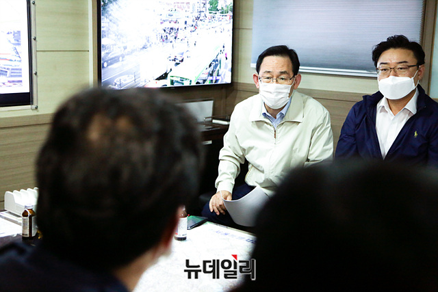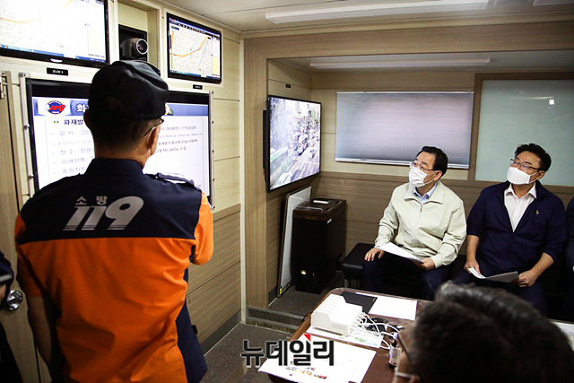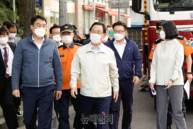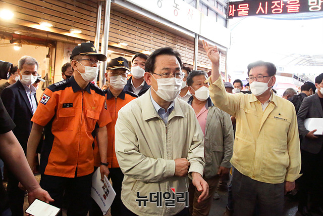 주호영 국민의힘 원내대표가 22일 오후 서울 청량리 청과물시장 화재현장을 둘러보고 있다. 이날 주 원내대표는 국회 차원의 대책마련을 약속했다. (사진=국민의힘)