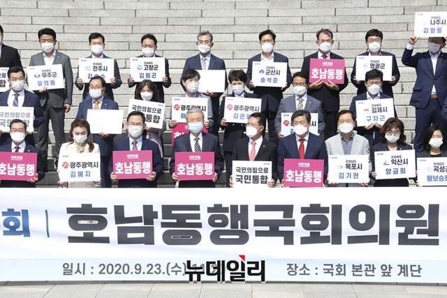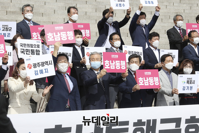 김종인 국민의힘 비상대책위원장, 주호영 원내대표, 정운천 국민통합위원장과 의원들이 23일 오전 국회 본청앞에서 열린 호남동행국회의원 발대식에서 동행지역 피켓을 들고 기념촬영을 하고 있다. (사진=국민의힘)