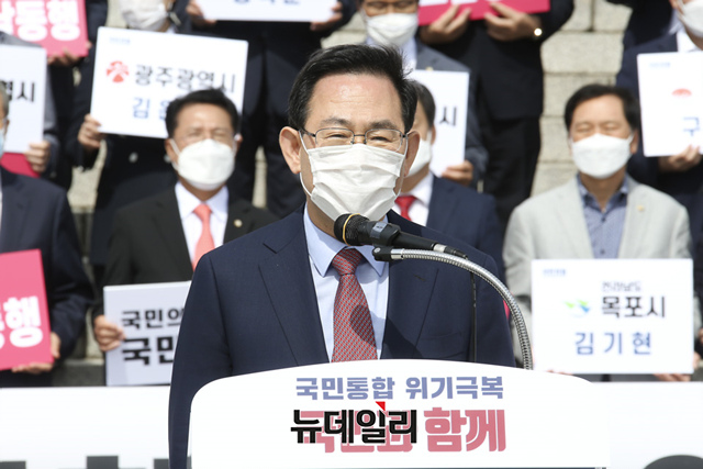 주호영 국민의힘 원내대표가 23일 오전 국회 본청앞에서 열린 호남동행국회의원 발대식에서 발언을 하고 있다. (사진=국민의힘)