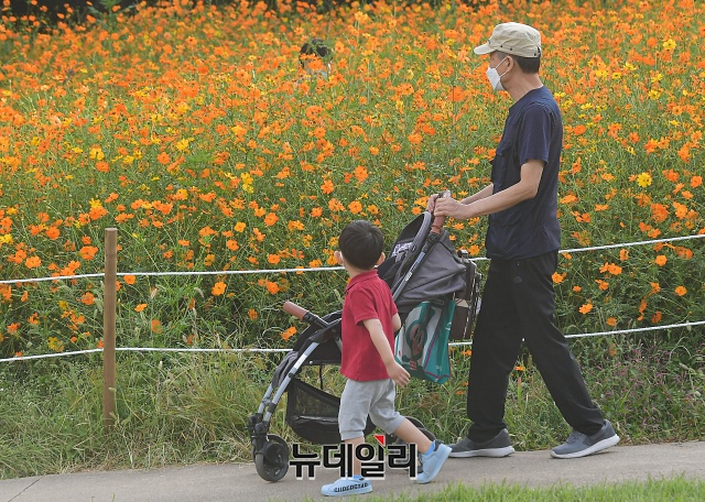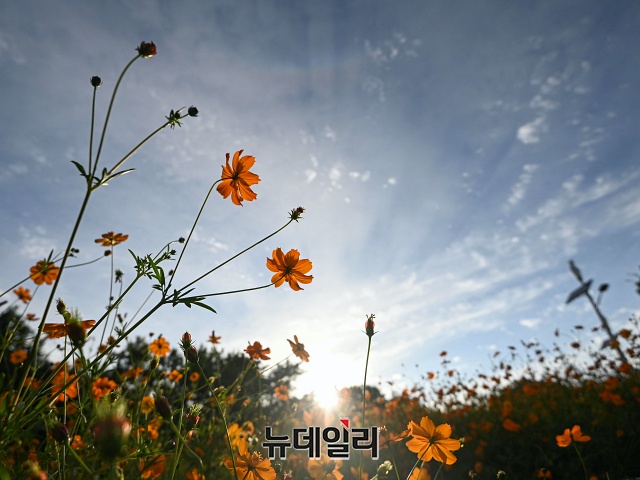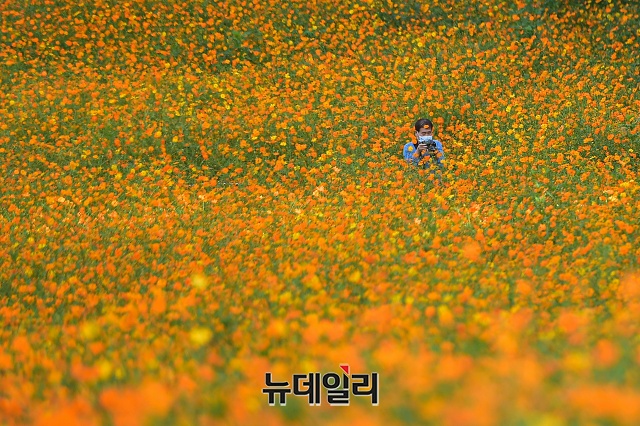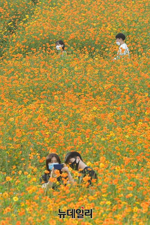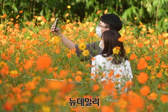올림픽공원을 찾은 시민들이 23일 오후 서울 송파구 올림픽공원 들꽃마루에 조성된 황화코스모스 밭에서 기념사진을 찍고 있다. 기상청은 23일 전국에 구름이 많고, 서울 낮 기온이 24도로 미세먼지 없는 맑은 날씨를 보인다고 예보했다.
