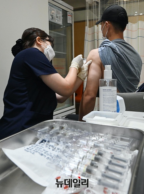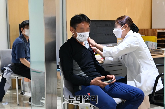 정부가 독감백신의 유통상 문제로 무료접종을 중단한 24일 오전 서울 강서구 한국건강관리협회 서울서부지부에서 내원객이 독감 예방접종을 맞고 있다.유료접종을 받으러 온 시민은 "무료접종은 중단되고 유료접종도 백신이 떨어지면 못맞을까봐 맞으러 왔다"고 했다.관계자는 "백신 문제가 불거져서 그런지 평소보다 많은 사람이 왔다"며 "코로나 때문에 사회적거리두기 2단계 수칙을 지켜야 해서 1m 간격으로 줄을 서니 줄이 훨씬 길어졌다"고 말했다.독감 무료접종은 22일부터 예정됐지만 백신 유통과정에서 상온노출 돼 중단된 상태다. 정부는 앞으로 2주간 문제가 된 백신의 효과, 부작용 등 품질 검사를 진행해 피해 규모를 확인 후 접종 사업을 재개한다고 밝혔다.