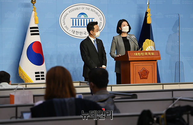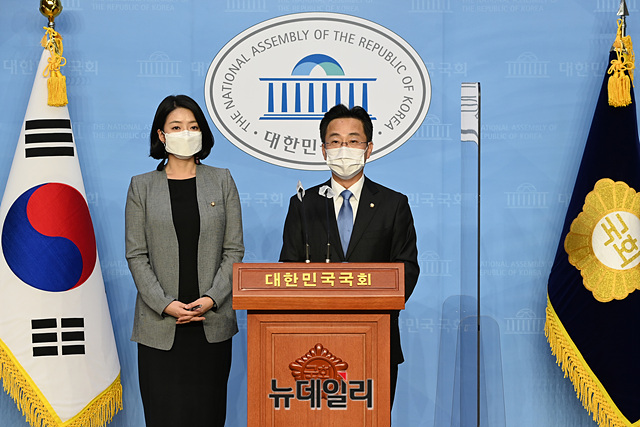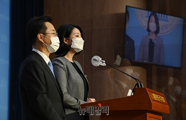 박성준 더불어민주당 원내대변인과 배현진 국민의힘 원내대변인이 24일 오후 국회 소통관 기자회견장에서 착한임대인 세제지원 적용기간 연장 관련 공동브리핑을 갖고 있다.
