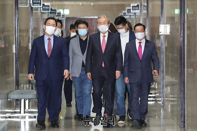 김종인 국민의힘 비상대책위원장, 주호영 원내대표 등 지도부가 24일 오전 국회에서 열린 비대위 회의에 입장하고 있다. (사진=국민의힘)