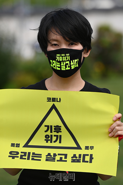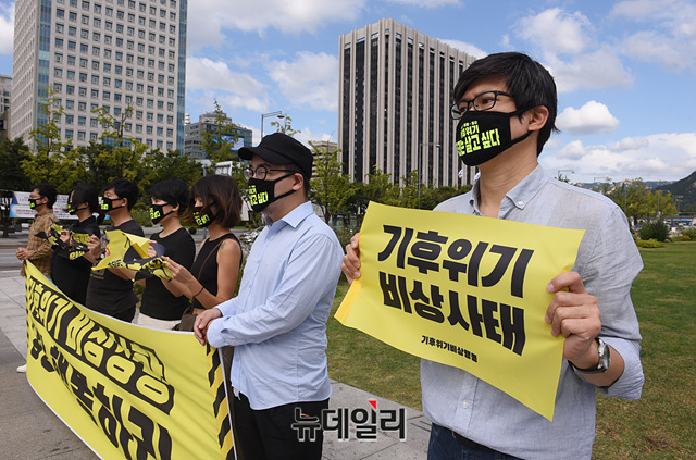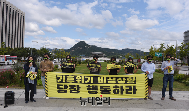 전 지구적 기후행동의 날인 25일 오전 서울 광화문광장에서 기후위기비상행동이 '글로벌 기후 행동의 날'과 관련해 기자회견을 갖고 있다.
