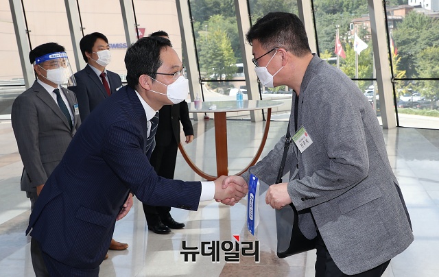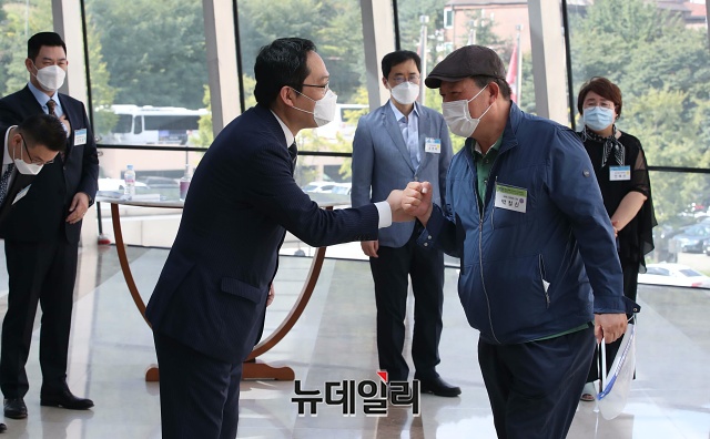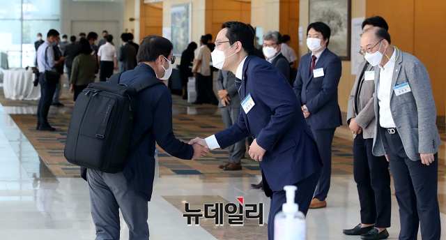 [포토] 대의원들 맞이하는 최대집 대한의사협회 회장