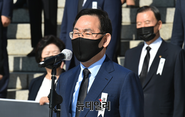 주호영 국민의힘 원내대표가 28일 오전 국회 본관 앞 계단에서 열린 '북한의 우리 국민 학살 만행 규탄 긴급의원총회'에서 발언을 하고 있다.