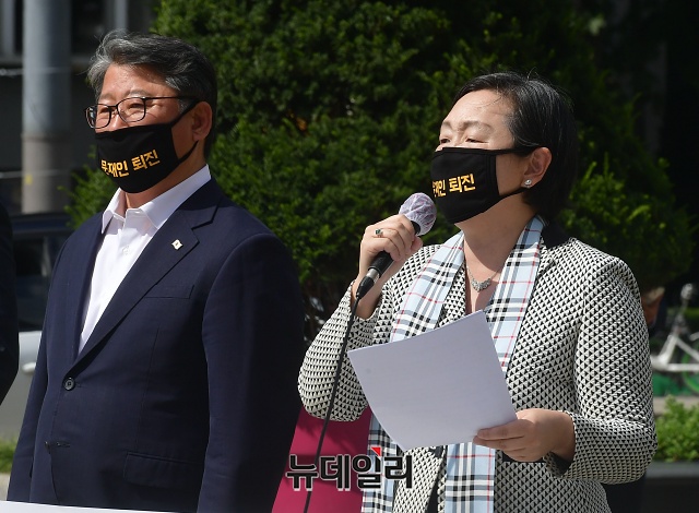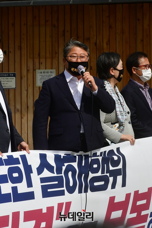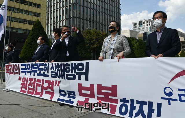 조원진 우리공화당 대표, 인지연 최고위원 등 관계자들이 28일 오후 서울 종로구 광화문광장 앞에서 김정은 만행 규탄 및 문재인 독재정권 규탄 기자회견을 하고 있다.이들은 "대한민국 공무원 피격사건 관련 문재인 대통령은 최초의 실종보고 이후 입장표명까지 47시간이나 침묵해 시간을 끌었다. 47시간 사이 대통령의 UN '종전선언' 연설은 진행됐고 공무원은 살해당했다"라며 "잔인한 반인륜범죄를 저지른 북한정권에 상응하는 군사적, 국제적 대응을 해야한다"고 밝혔다.