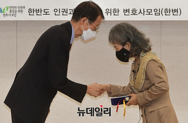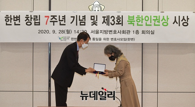 박선영 사단법인 물망초 이사장이 28일 오후 서울 서초구 서울지방변호사회에서 열린 '한변 창립 7주년 기념 및 제3회 북한인권상 시상식'에서 수상 후 기념촬영을 하고 있다.북한인권상은 한변이 2018년부터 북한인권 개선과 자유통일을 위해 노력한다는 취지로 제정한 인권상이다. 올해 북한인권상은 사단법인 물망초가 받았다. 물망초는 7월 탈북 국군포로 2명이 북한과 김정은을 상대로 손해배상소송을 제기해 승소를 지원했다.이번 행사엔 나경원 전 자유한국당 원내대표, 박영아 정교모 공동대표, 이찬희 대한변호사협회장, 이인호 서울대 명예교수 등이 참석했다.