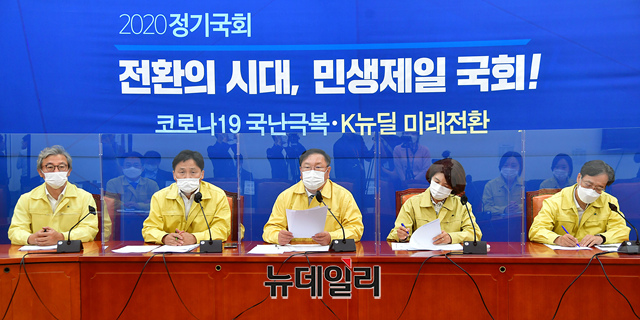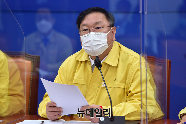 김태년 더불어민주당 원내대표가 29일 오전 국회에서 열린 원내대책회의에서 모두발언을 하고 있다. (사진=공동취재단)