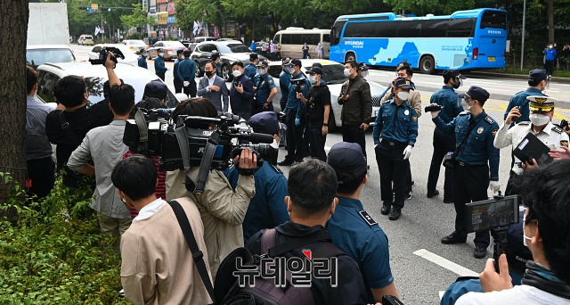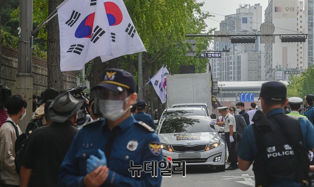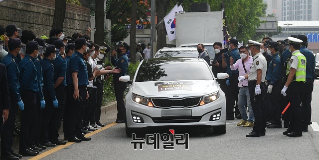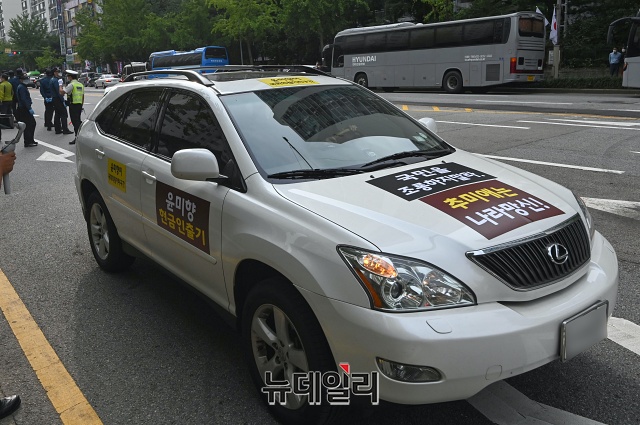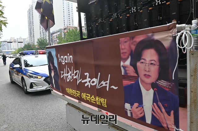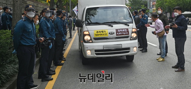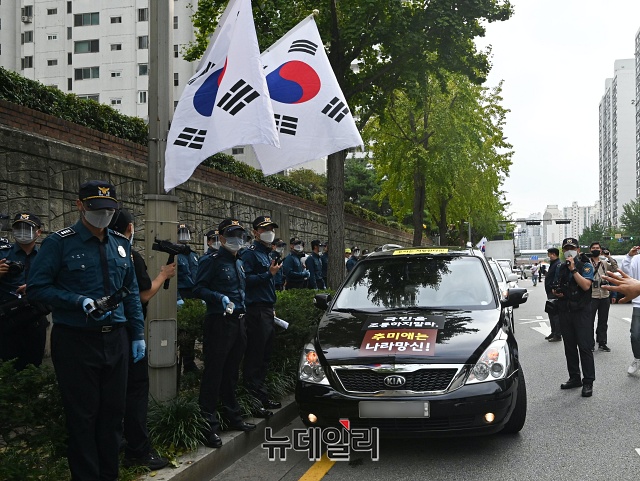 시민단체 대한민국애국순찰팀이 3일 오후 서울 광진구 추미애 법무부 장관 자택 인근에서 추 장관의 사퇴를 촉구하는 차량집회를 마치고 해산하고 있다.이날 차량집회 참가자들은 조국 전 법무부 장관 자택 인근을 지나 추 장관 자택이 있는 광진구 아파트 앞까지 차량으로 집회를 했다. 집회차량에는 '추미애는 나라망신' '우리국민 개, 돼지 아닙니다' '국민을 조롱하지말라' 등의 문구가 붙었다.추 장관 자택 인근에선 사퇴를 촉구하는 의미로 경적을 울리며 지나갔다.