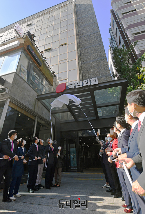[포토] 국민의힘 새당사 현판식…2년만에 여의도 복귀