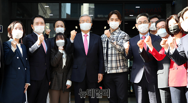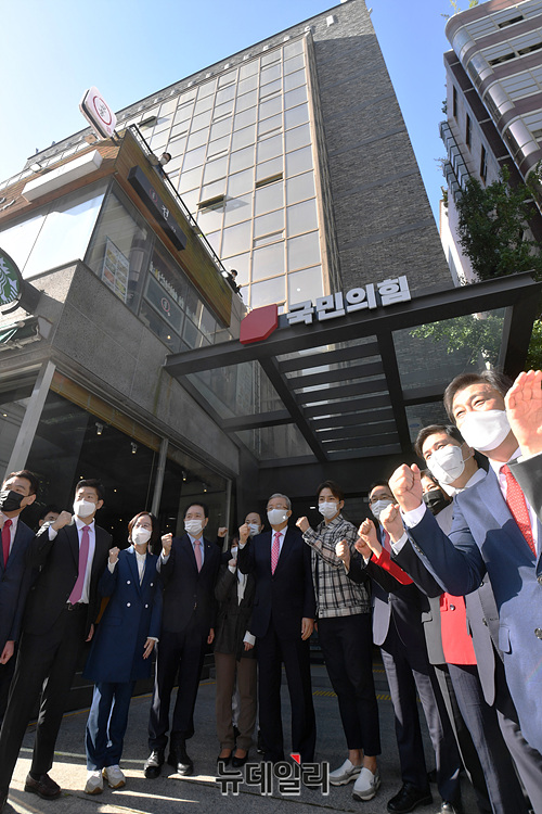 김종인 국민의힘 비상대책위원장과 주호영 원내대표 등 당 지도부가 5일 오전 서울 여의도 남중빌딩에 위치한 새 당사에서 현판식을 하고 있다. (사진=공동취재단)