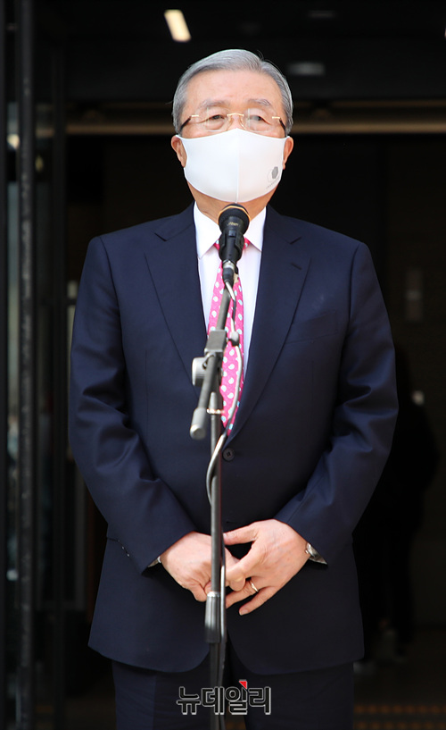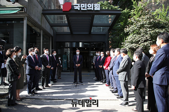 김종인 국민의힘 비상대책위원장이 5일 오전 서울 여의도 남중빌딩에 위치한 새 당사에서 현판식을 갖고 인사말을 하고 있다. (사진=공동취재단)