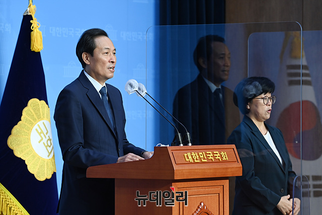 우상호 더불어민주당 의원이 5일 오전 국회 소통관 기자회견장에서 이동통신요금 개편안 관련 기자회견을 갖고 있다.