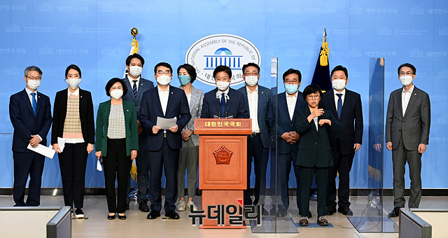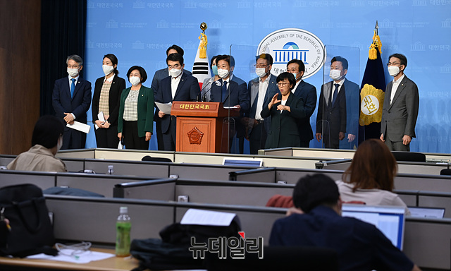 노웅래 더불어민주당 미디어 언론 상생 TF 위원장 등 위원들이 5일 오후 국회 소통관 기자회견장에서 '더불어민주당 미디어 언론상생 TF발족 기자회견'을 갖고 있다.