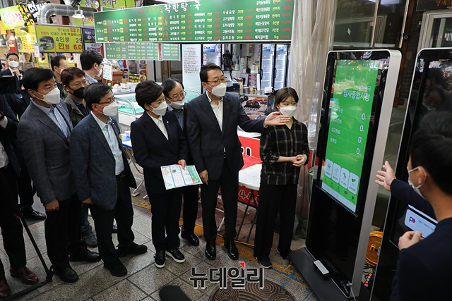 이광재 더불어민주당 미래전환 K-뉴딜위원회 총괄본부장 등 의원들이 5일 오전 서울 강동구 암사종합시장에서 열린 미래전환 K-뉴딜위원회 암사스마트시장 현장간담회를 갖고 있다. (사진=공동취재단)