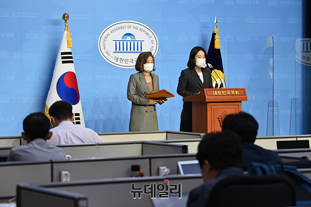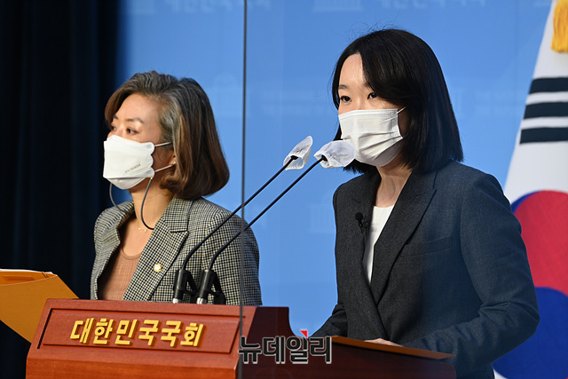 이소영 더불어민주당 의원, 양이원영 의원이 5일 오후 국회 소통관 기자회견장에서 한전의 베트남 붕앙2 석탄발전소 사업 투자 결정 규탄 기자회견을 갖고 있다.