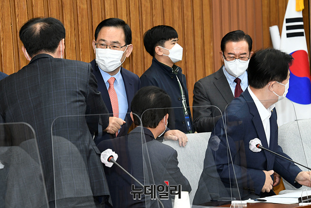 주호영 국민의힘 원내대표 등 지도부가 6일 오전 국회에서 열린 국민의힘 국정감사 사전대책회의에 입장하고 있다. (사진=공동취재단)