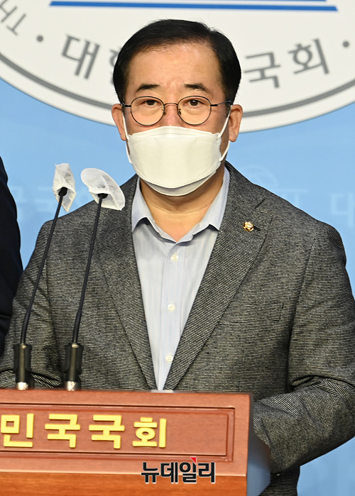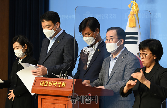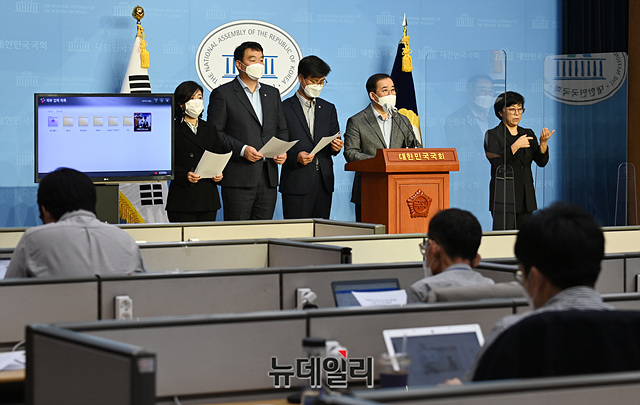 국회 과학기술정보방송통신위원회 간사인 박성중 국민의힘 의원 등 과방위 위원들이 6일 오전 국회 소통관 기자회견장에서 증인채택 요구 관련 기자회견을 갖고 있다.