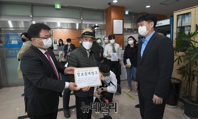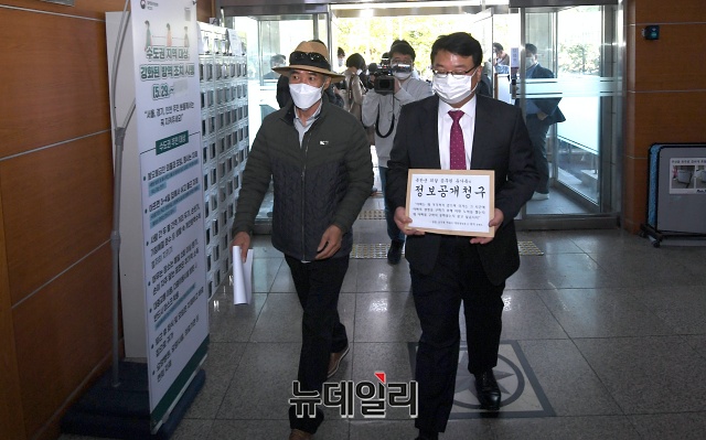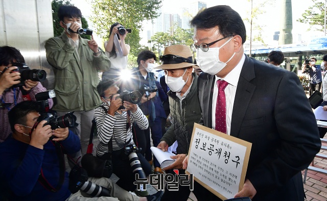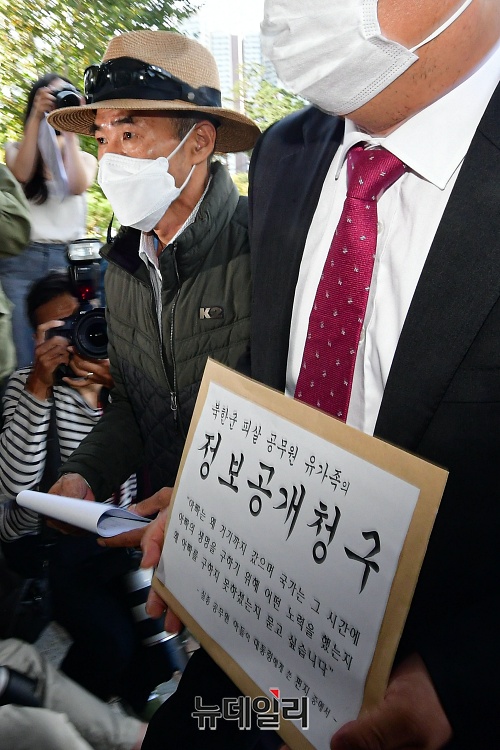 북한 피격사망 공무원 A씨의 형 이래진씨가 6일 오후 서울 용산구 국방부 종합민원실에서 유가족 정보공개청구서를 제출하고 있다.이 씨는 "감청 자료를 들어보면 월북 의사를 표했는지 확인할 수 있고, 북한군의 총구 앞에서 진의(眞意)에 의해 월북 의사표시를 한 게 맞는지 전후 내용을 통해 확인할 수 있다"며 "9월 22일 오후 3시 30분부터 오후 10시 51분까지의 감청 자료, 같은날 오후 10시 11분부터 10시 51분까지 시신을 훼손하는 녹화 파일을 공개해 달라"고 했다.유족들이 정보공개를 청구한 자료는 북한군의 대화를 감청한 오디오 녹음파일과, 피살 공무원의 시신을 훼손시키는 장면을 촬영한 비디오 녹화파일 2가지다. 정보공개법에 따라 국방부는 청구를 받은 날부터 10일 이내에 공개 여부를 결정해야 한다.
