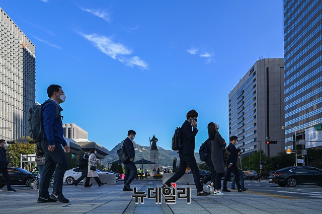 전국 대부분 지역 아침 기온이 10도 이하로 내려간 7일 오전 서울 종로구 광화문역 인근에서 직장인들이 쌀쌀한 기온에 겉옷을 입고 출근하고 있다.