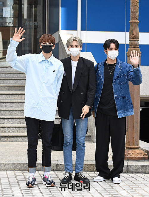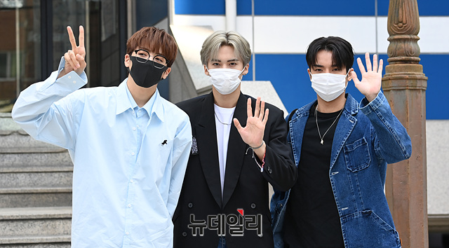 아이돌그룹 펜타곤 우석, 옌안, 유토가 7일 오전 서울 강서구 iHQ 미디어에서 진행된 CUBETV 예능 프로그램 '큐브통신' 녹화 전 포토타임을 갖고 있다.