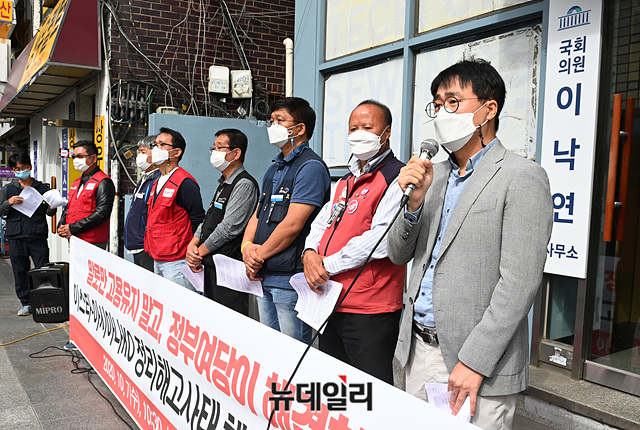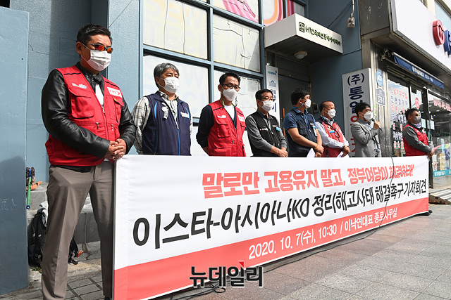 이스타항공 조종사 노동조합과 아시아나KO 노동조합 등 민노총 공공운수노조 조합원들이 7일 오전 서울 종로구 이낙연 더불어민주당 대표 사무실 앞에서 열린 '이스타-아시아나KO 정리해고사태 해결 촉구 공동행동 기자회견'에서 구호를 외치고 있다.이들은 "9월 24일 이상직 의원은 더불어민주당을 탈당하며 이스타항공과 직원들의 일자리를 되돌려놓고 복당하겠다고 주장했지만, 14일 해고를 앞두고 해결방안을 내놓지 않고 묵묵부답하고 있다"고 비판했다.이어 "아시아나KO는 노동자 5명 부당해고 판정에 대해 악의적으로 불복하고 두 달째 복직을 이행하고 있지 않다. 원청 아시아나항공의 중재 노력에도 성실히 교섭에 임하고 있지 않다"고 말했다.또 "이낙연 더불어민주당 대표가 노동자들의 생존권이 벼랑 끝에서 추락하는 것을 '주목'만 할 것이 아니라, '고용유지' 정책기조에 따라 적극적으로 대책을 강구할 것을 촉구한다"고 밝혔다.