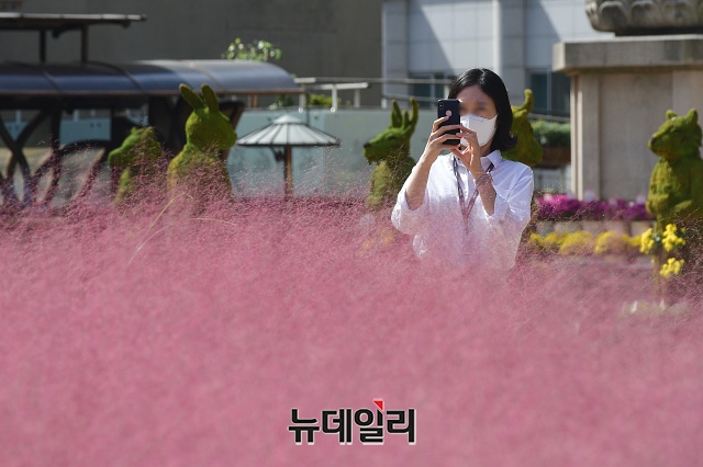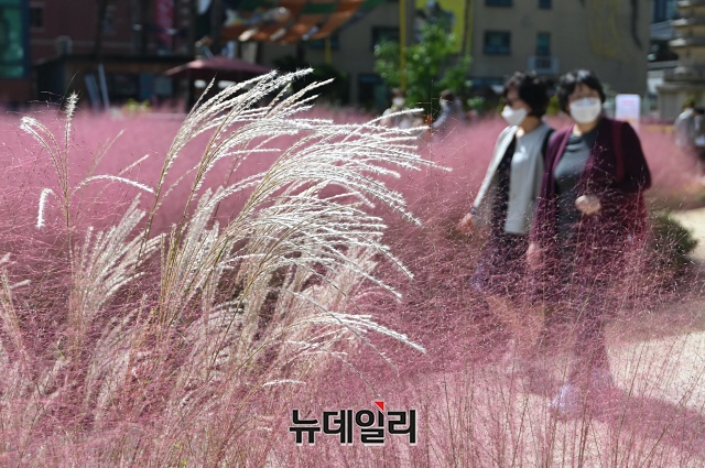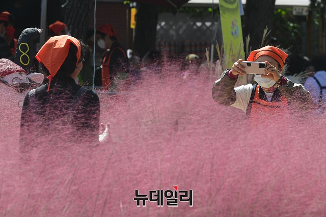 서울 종로구 조계사를 찾은 시민들이 7일 오후 핑크뮬리 앞에서 기념사진을 찍고 있다. 조계사는 10일부터 '시월국화는 시월에 핀다더라'를 주제로 제10회 조계사 국화향기 나눔전을 개최한다.