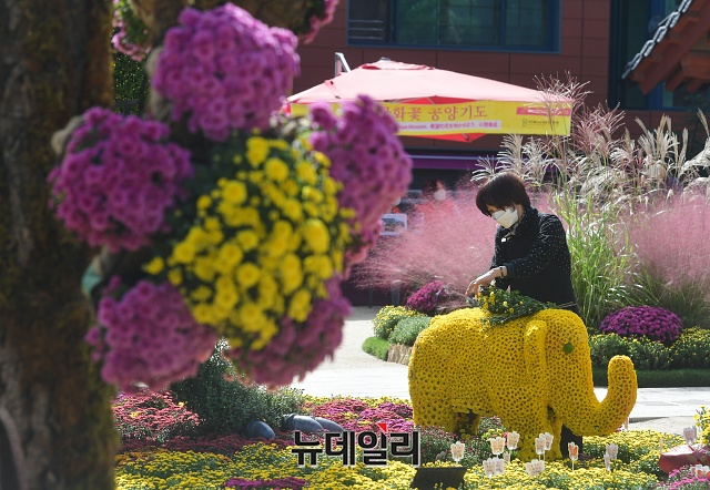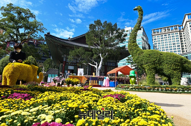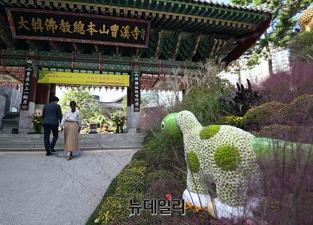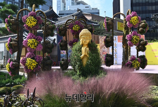 [포토] 핑크빛 물든 조계사 '국화향기 나눔전' 개최