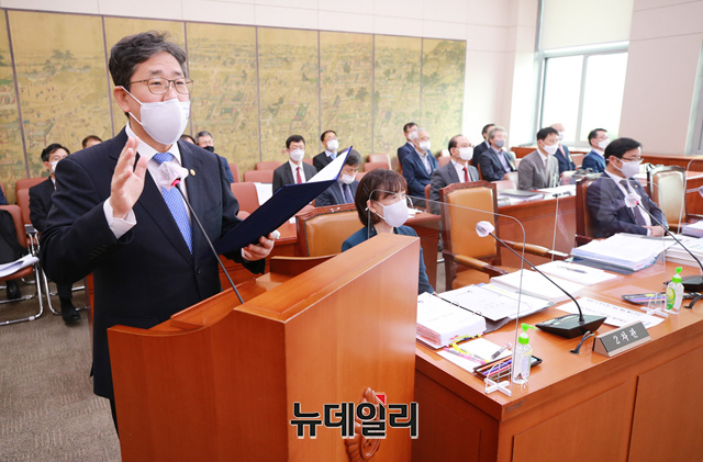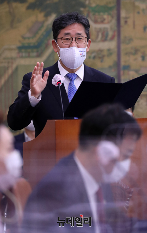 박양우 문화체육관광부 장관이 7일 오전 국회에서 열린 문화체육관광위원회 국정감사에서 선서를 하고 있다. (사진=공동취재단)