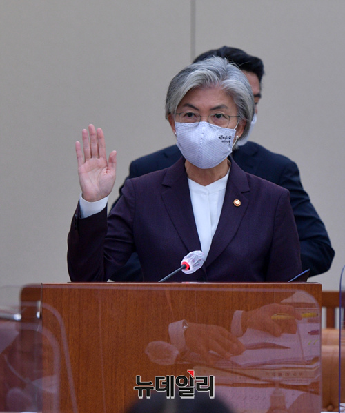 강경화 외교부 장관이 7일 오전 국회 외교통일위원회에서 열린 외교부에 대한 국정감사에 출석해 증인선서를 하고 있다. (사진=공동취재단)