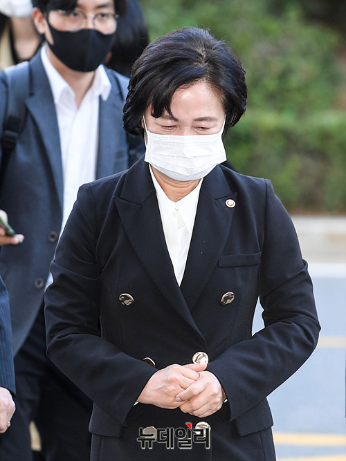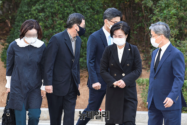 추미애 법무부 장관이 상관의 폭언·폭행에 시달리다 극단적인 선택을 한 故 김홍영 검사의 근무지었던 서울 양천구 서울남부지검을 방문한 8일 오전 추 장관이 취재진의 질문에 답하지 않고 故 김 검사 부모와 함께 청사에 들어서고 있다.
