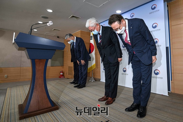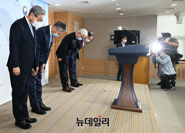 김연수 서울대병원장을 비롯한 대학병원장들이 8일 오전 서울 종로구 정부서울청사에서 의대생 4학년 의사 국가고시 미응시 문제 사과 성명을 발표하기 앞서 고개숙여 인사하고 있다.