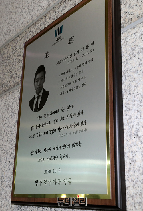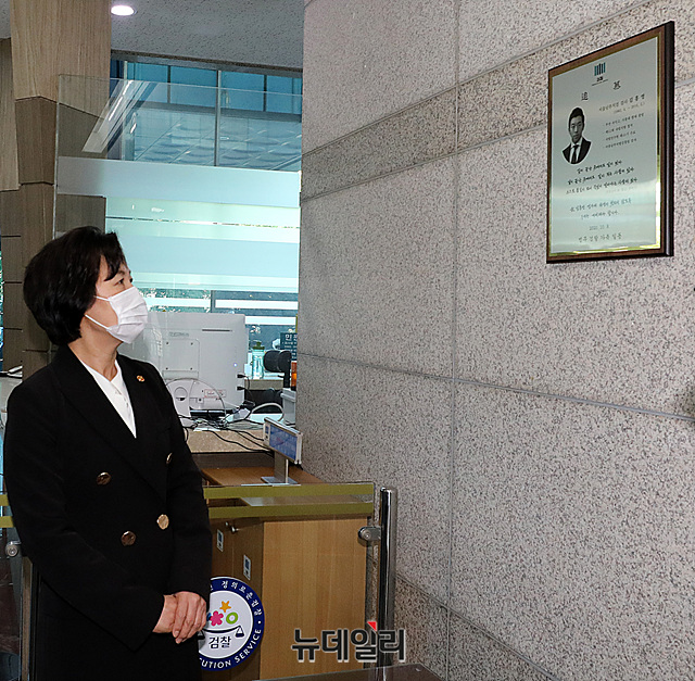 추미애 법무부 장관이 상관의 폭언·폭행에 시달리다 극단적인 선택을 한 故 김홍영 검사의 근무지었던 서울 양천구 서울남부지검을 방문한 8일 오전 추 장관이 故 김 검사의 추모패를 바라보고 있다.