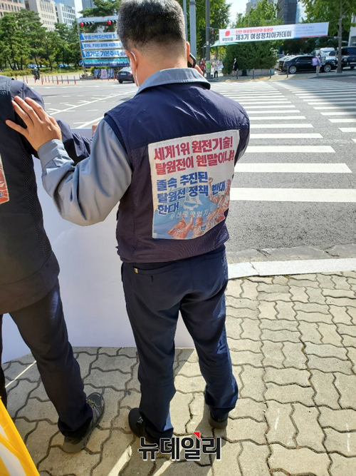 금속노조 두산중공업지회 소속 근로자들이 7일 국회 정문 앞에서 "졸속 추진된 탈원전 정책을 반대한다"고 적힌 복장을 입고 기자회견을 갖고 있다.