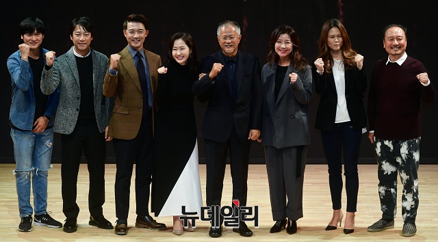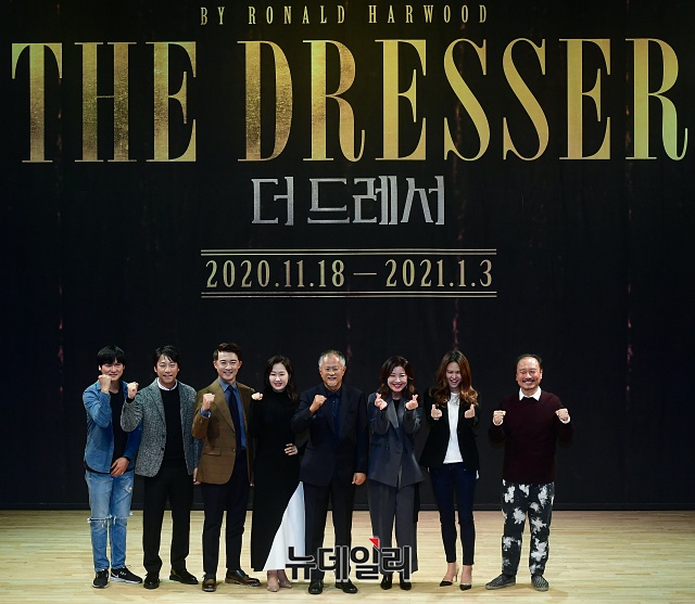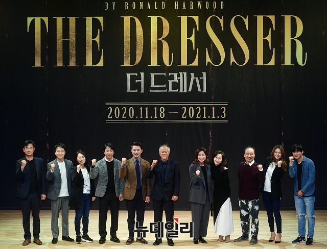 연극 '더 드레서' 출연진이 8일 오후 서울 중구 정동극장에서 열린 '더 드레서(THE DRESSER, 연출 장유정)' 제작발표회에서 포토타임을 갖고 있다.'더 드레서'는 영화 '피아니스트' 각본으로 유명한 로날드 하우드 작가의 작품으로 1981년 미국 브로드웨이에서 초연됐다. 2차 세계대전이 한창인 당시 셰익스피어 전문 극단을 중심으로 '리어왕' 공연을 앞두고 벌어지는 노배우와 그의 드레서에 관한 이야기다.11월 8일부터 2021년 1월 3일까지 정동극장에서 공연된다.