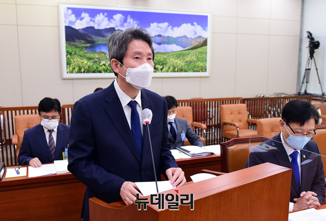 이인영 통일부 장관이 8일 오전 국회에서 열린 외교통일위원회의 통일부 등에 대한 국정감사에서 업무보고를 하고 있다. (사진=공동취재단)