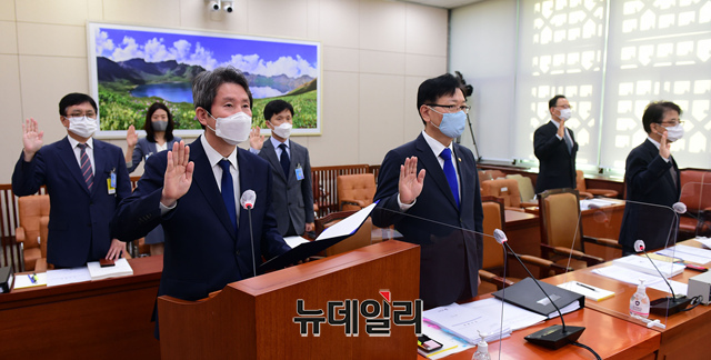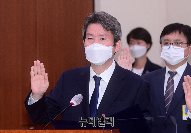 이인영 통일부 장관이 8일 오전 국회에서 열린 외교통일위원회의 통일부 등에 대한 국정감사에서 선서를 하고 있다. (사진=공동취재단)