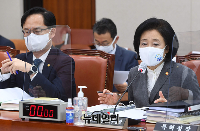 박영선 중소벤처기업부 장관이 8일 오전 국회에서 열린 국회 산업통상자원중소벤처기업위원회의 중소벤처기업부·특허청 등에 대한 국정감사에 출석해 의원 질의에 답하고 있다. (사진=공동취재단)