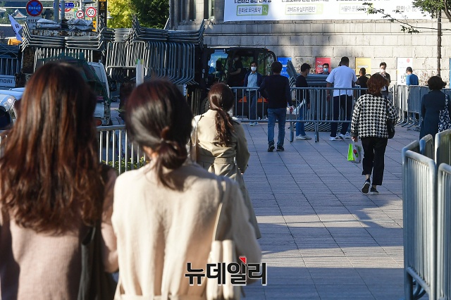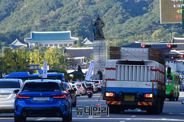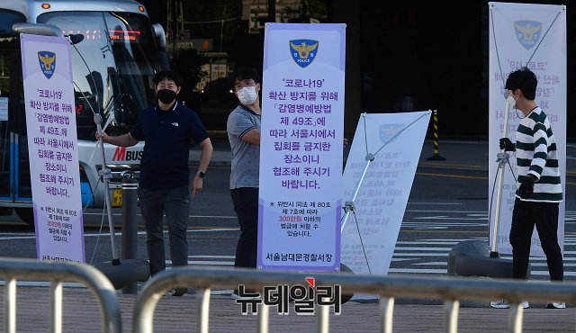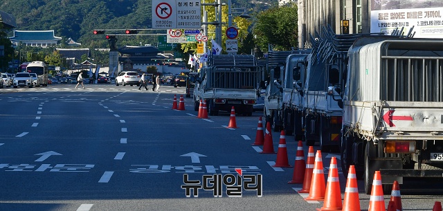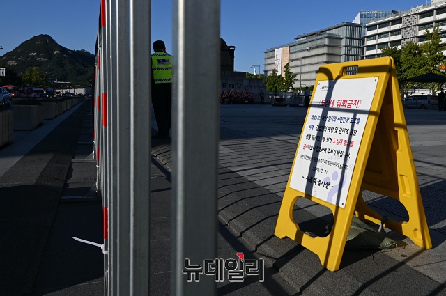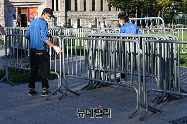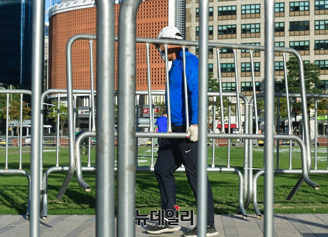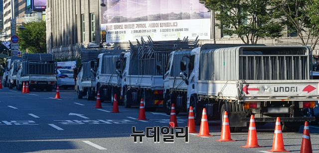 한글날을 하루 앞둔 8일 오후 펜스를 실은 트럭들이 서울 중구 서울시청 인근에서 대기하고 있다.서울시는 9일 광화문광장 일대에 집회금지 조치를 내렸다. 집회 개최시 주최자와 참여자를 고발하고, 확진자 발생시 손해배상 청구도 병행할 예정이다. 또 시청역, 경복궁역, 광화문역 등 광화문 인근의 지하철 무정차 통과를 검토중이라고 밝혔다.김창룡 경찰청장은 8일 국정감사에서 한글날 불법집회에 대비하기 위해 광화문 광장 일대에 경찰버스를 동원해 차벽을 설치하겠다고 밝혔다.서울시와 경찰은 3일 개천절에도 집회금지 조치와 차벽을 설치한 바 있다.