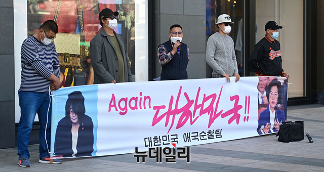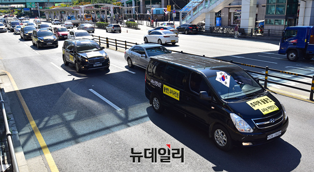 황경구 대한민국애국순찰팀 단장이 9일 오전 경기 수원역 앞에서 차량집회에 앞서 기자회견을 갖고 있다.황 단장은 "우리사회 기본질서 확립과 보편타당한 가치를 지키기 위해, 경기도에서 출발해 서울 한복판을 가르며 국민계몽에 나선다"며 "정부가 독선적일때 국민저항은 계속된다"고 했다.애국순찰팀은 검정 차량 9대를 가두행진에 사용했다. 태극기를 차량에 달고, 차량에는 '나라는뭘했나요? 불쌍한 우리국민' '추미애 꼴불견 우리는저항한다' '중국폐렴 희생자를 보상하라' 등의 문구를 붙혔다.가두행진은 수원역에서 출발해 조국 전 장관 자택과 추미애 법무부 장관 자택을 돌며 종료할 예정이다. (경기 수원=정상윤 기자)