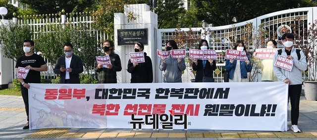 지난 8월 22일부터 평화로운 대한민국 영토 내에서 북한의 체제선전물이 입 수 경로도 확인되지 않은 채 통일부 산하기관에 의해 버젓이 전시되고 있 다. 심지어 문제 된 그림은 국제연합(UN)의 제재대상인 북한 ‘만수대창작사’ 소속 근로자들의 작품이다. 통일부 산하 통일교육원에 의해 오두산통일전망 대에 8월 22일부터 11월 14일까지 전시되는 그림이다.