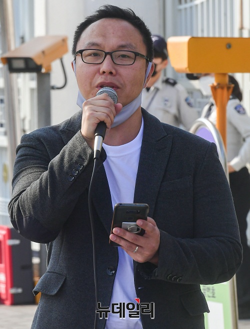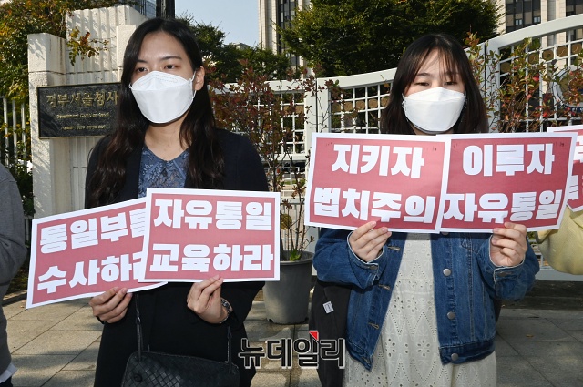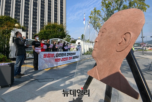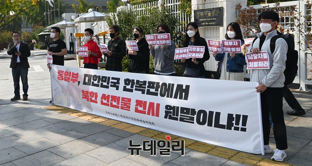 김은구 트루스포럼 대표가 12일 오전 서울 종로구 정부서울청사 앞에서 열린 '통일부 북한체제선전물 전시 규탄 기자회견'에서 발언하고 있다.김 대표는 "국제연합(UN)의 제재대상인 북한 '만수대창작사' 소속 근로자의 북한 체제선전물이 통일부 산하 오두산 통일전망대에 전시되고 있다"며 "입수 경로도 확인되지 않았고, 전시에 세금 5,000만원이 할당됐다"고 말했다.이어 △전시작품의 입수 경로 공개 △북한 체제선전물을 전시한 책임자 징계 △북한 체제선전물 밀반입자 색출 및 엄벌 등을 요구했다.