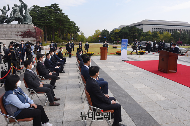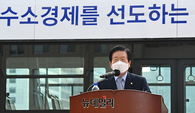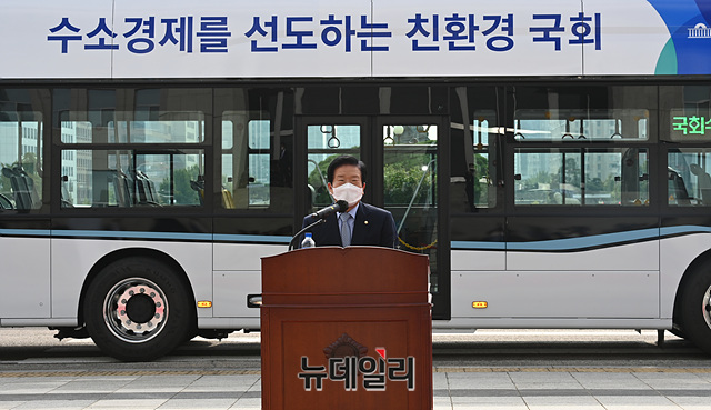 박병석 국회의장이 12일 오전 국회에서 열린 수소버스 시승식에서 인사말을 하고 있다. 이날 공영운 현대차 사장, 이윤규 현대차 버스프로젝트 총괄 등이 참석했다.
