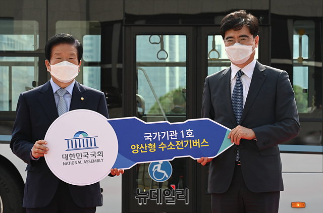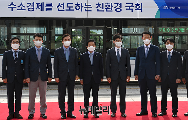 박병석 국회의장, 공영운 현대차 사장 등 참석자들이 12일 오전 국회에서 열린 수소버스 시승식에서 기념촬영을 갖고 있다.