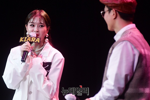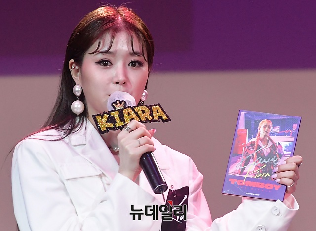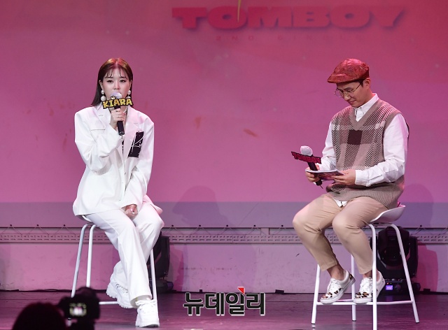 가수 키아라(KIARA)가 13일 오전 서울 강서구 서울호서예술실용전문학교에서 열린 두번째 싱글 'TOMBOY(톰보이)' 쇼케이스에서 앨범 소개를 하고 있다.